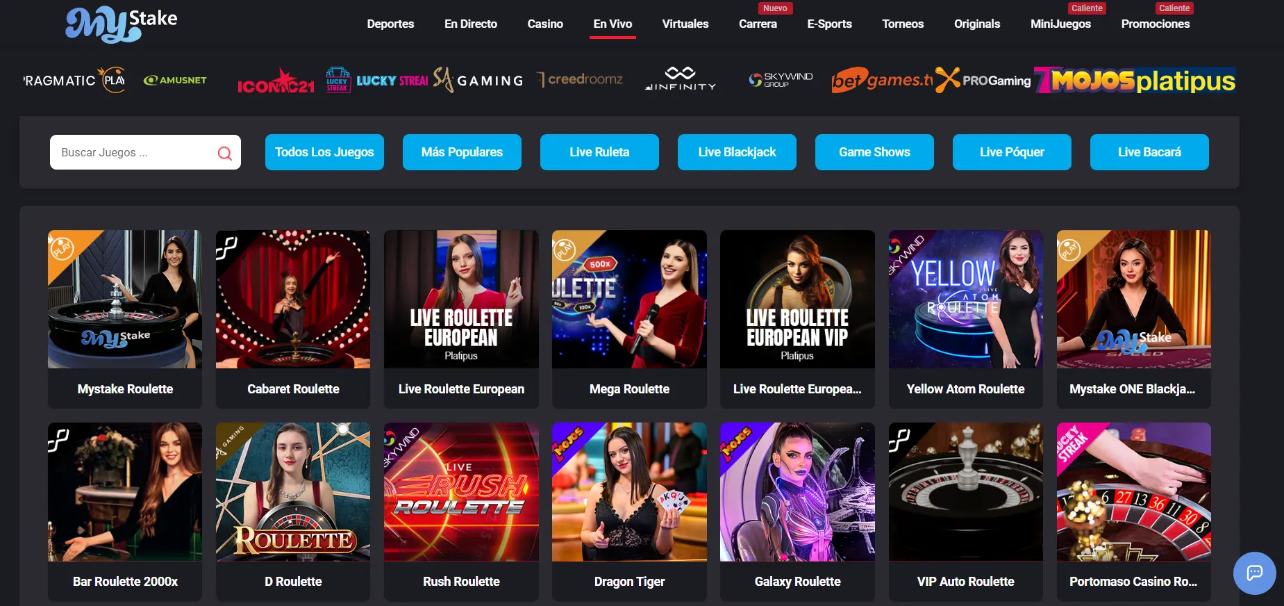 Aunque MyStake no ofrece juegos de mesa estándar, su sección de casino en vivo compensa muy bien esta ausencia. Encontramos más de 280 mesas en vivo disponibles, con proveedores de primer nivel como Pragmatic Play Live, Amusnet y Skywind Group.