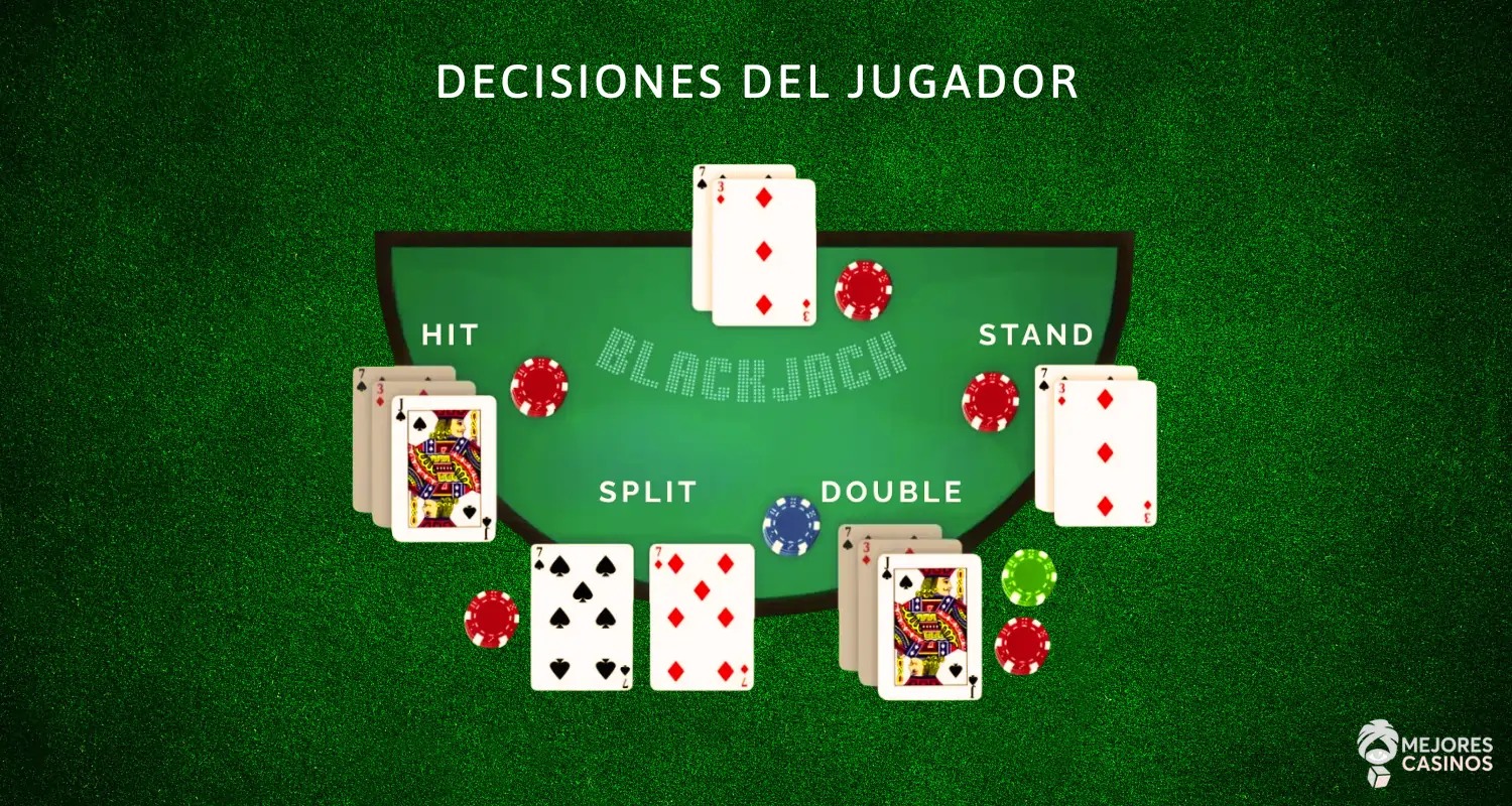 Cada jugador comienza con dos cartas y puede elegir pedir carta, plantarse, doblar la apuesta o dividir, según su mano.