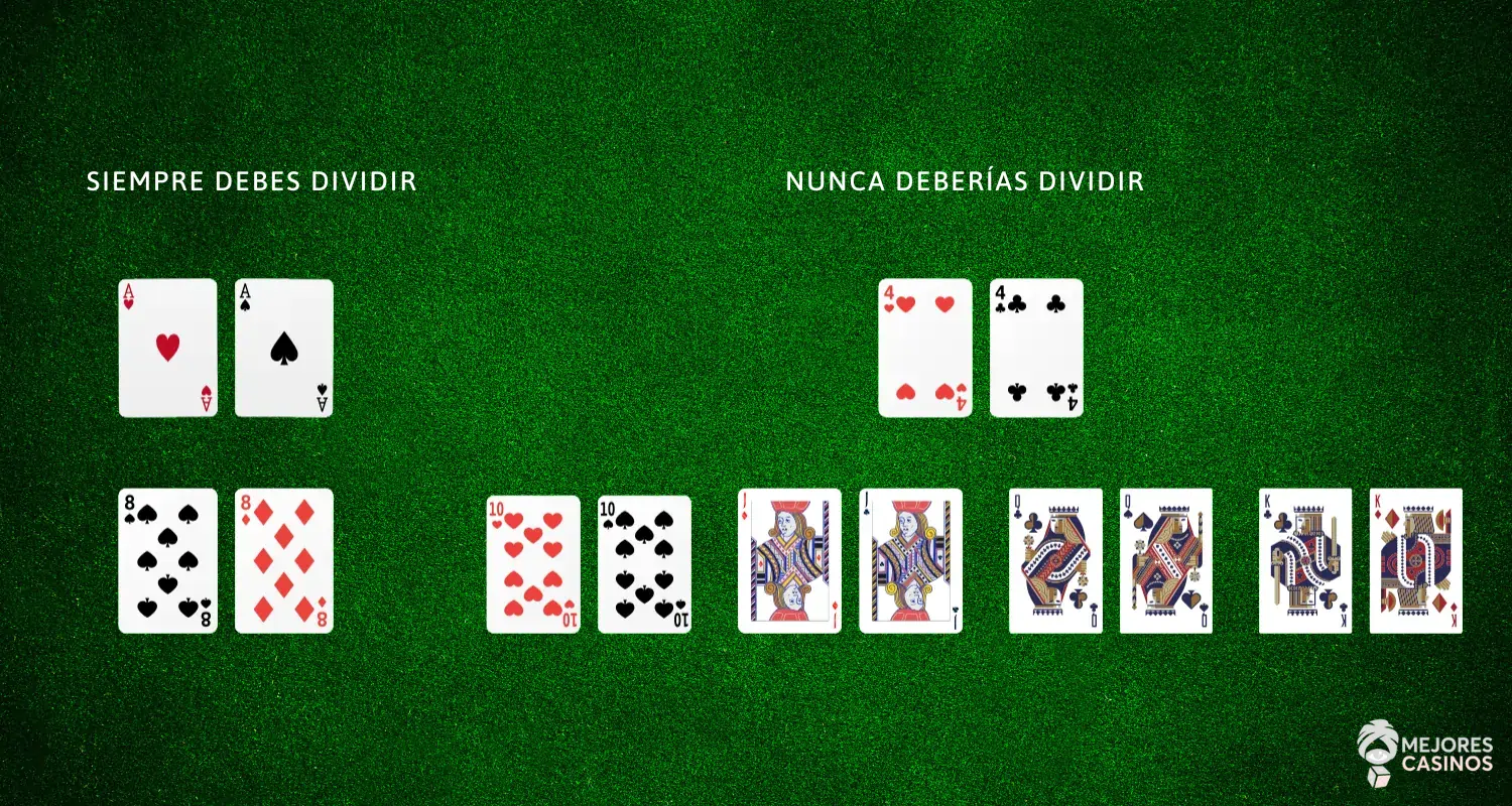 - En raras ocasiones (como dividir 9s contra un 7), dividir puede reducir tus posibilidades de ganar en comparación con mantener la mano completa.