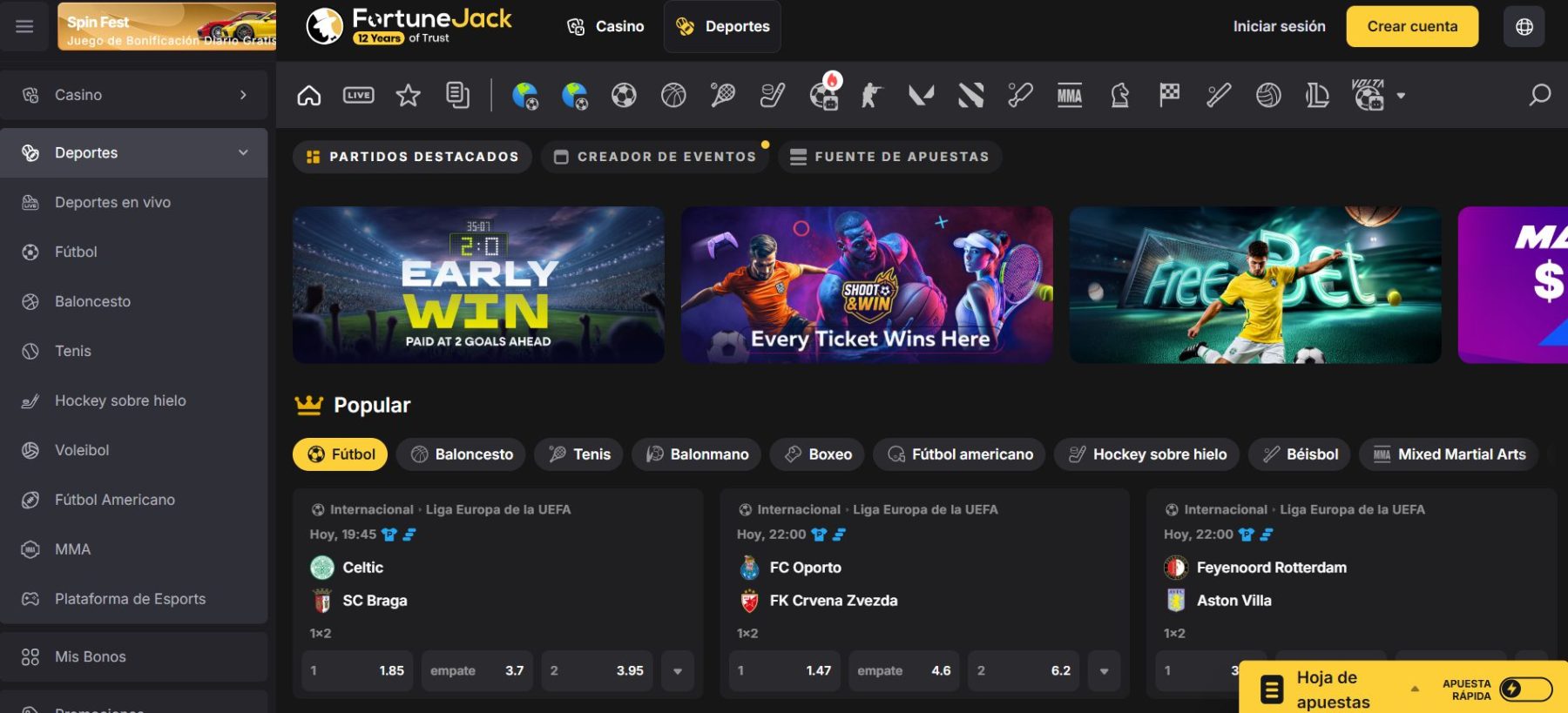 Si quieres tomarte un descanso del casino y probar con las apuestas deportivas, FortuneJack ofrece una amplia variedad de deportes en los que apostar. Encontrarás desde opciones populares como fútbol, baloncesto y tenis, hasta deportes de nicho y esports.