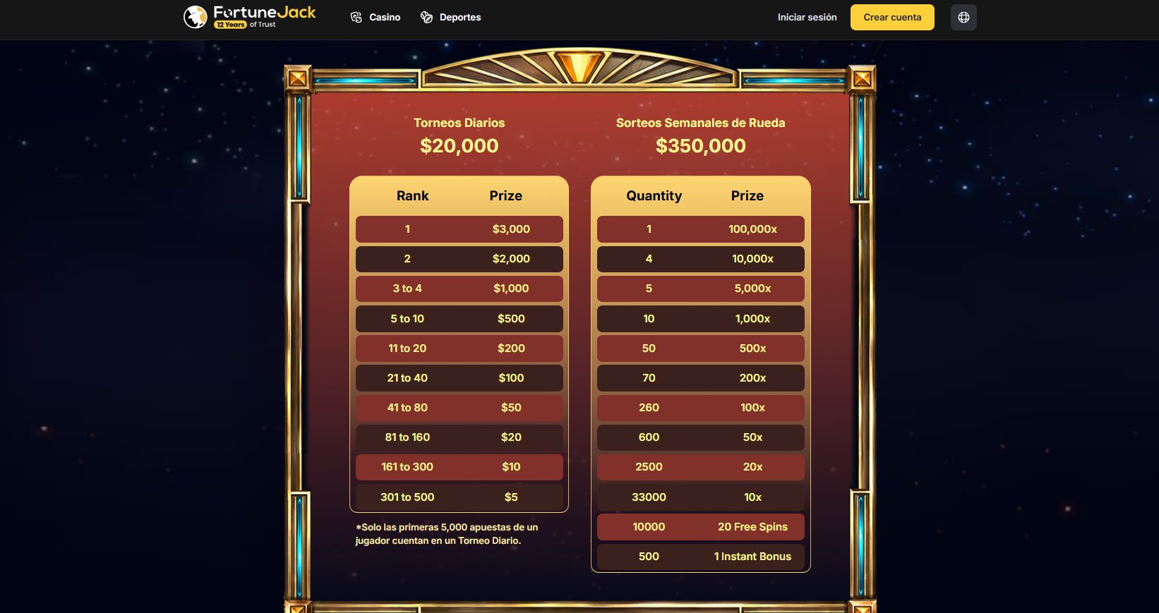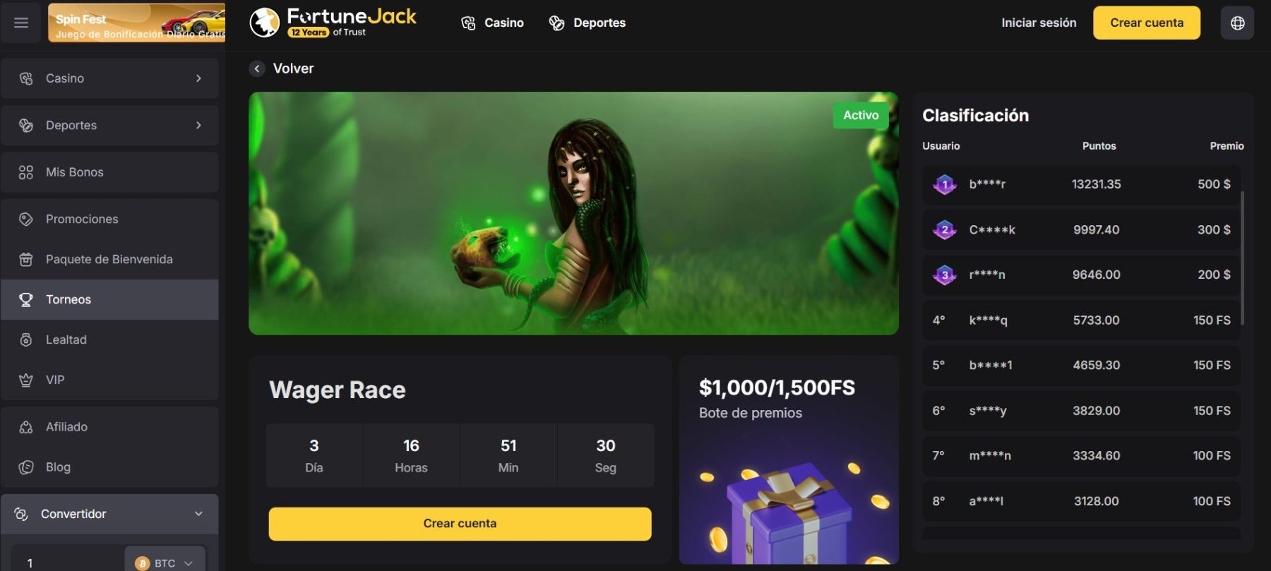 Cada semana, de lunes a domingo, FortuneJack organiza una carrera con 1,000 USD en efectivo y 1,500 giros gratis en premios.