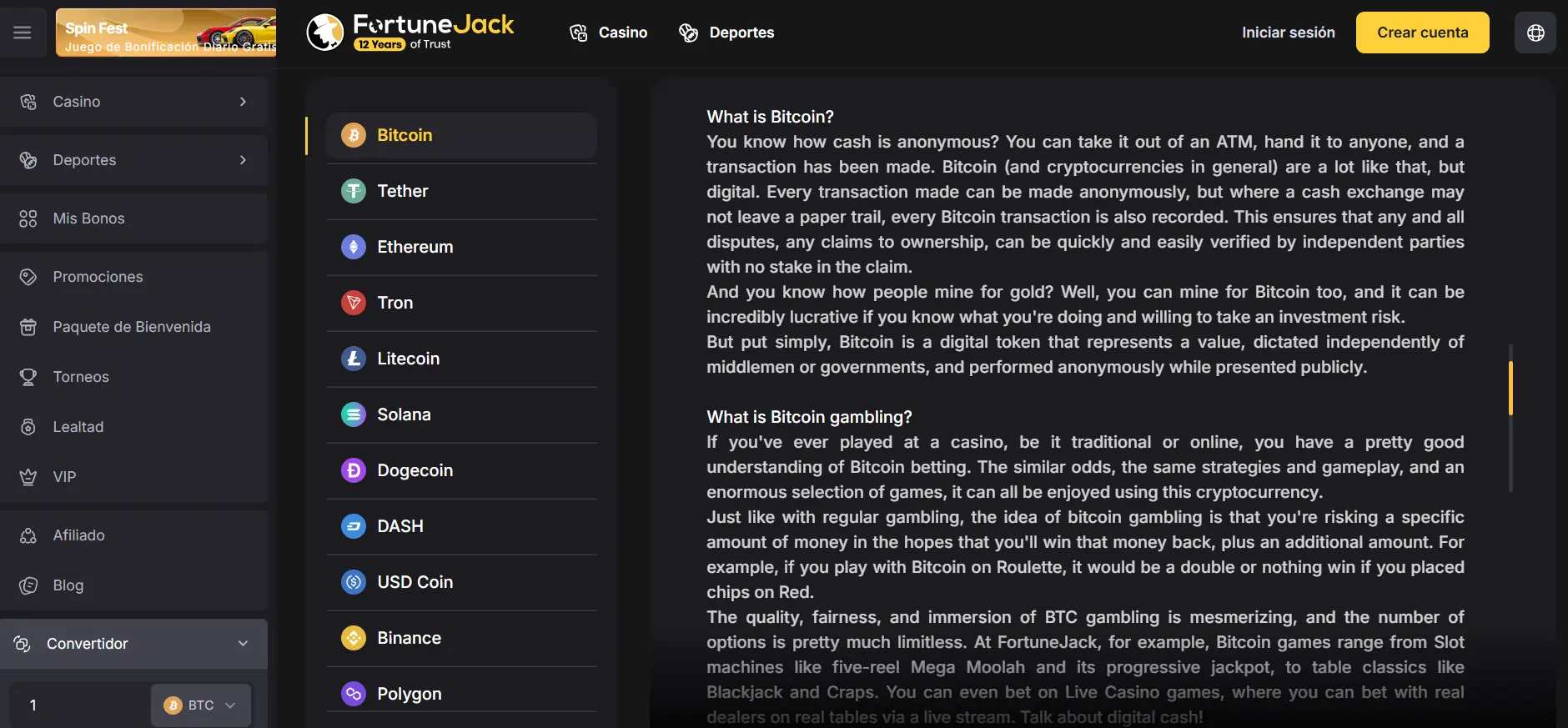 Mostrar más 👀Con más de 10 años de experiencia, FortuneJack se ha consolidado como uno de los principales casinos online de criptomonedas, ofreciendo desde tragamonedas hasta mesas en vivo. Con soporte para más de 10 criptomonedas, una interfaz intuitiva y transacciones rápidas, ha logrado captar la atención de jugadores de todo el mundo.