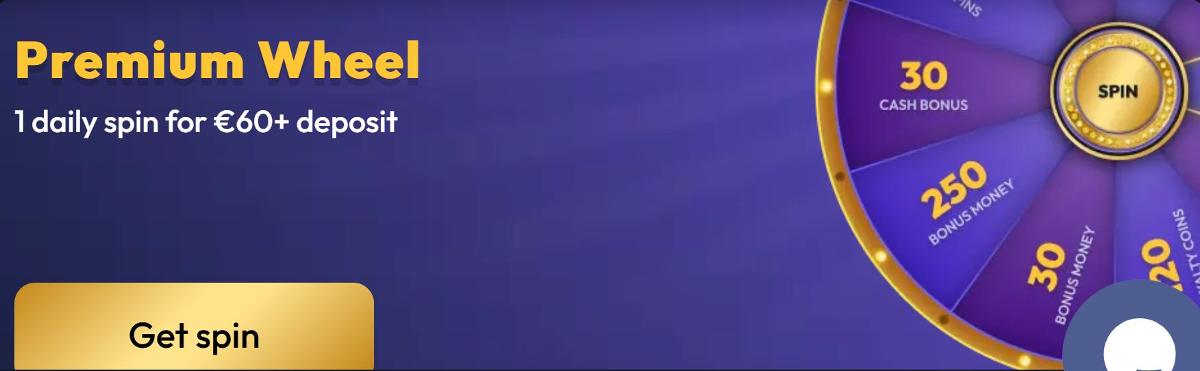 Si buscas más adrenalina, la Premium Wheel es tu billete hacia premios más grandes. Con solo 60 € de depósito, puedes participar y obtener bonos generosos, multiplicadores impresionantes y regalos especiales.