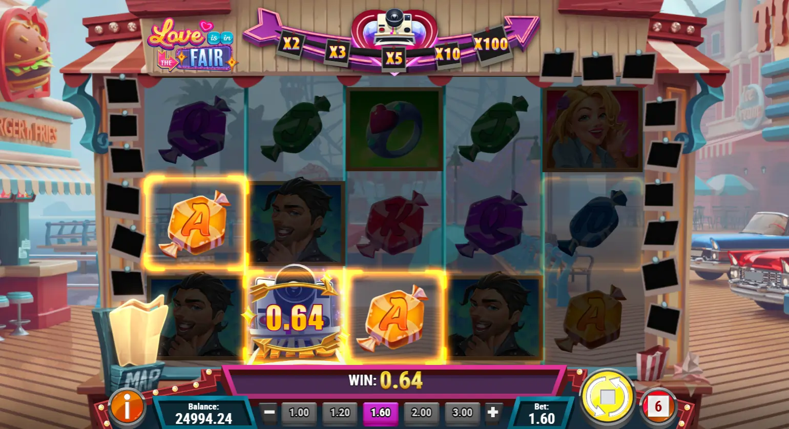 Te espera una cita junto al mar, donde podrás ganar premios, capturar momentos y disfrutar de la vista desde la rueda de la fortuna. Al girar los carretes de 5×3, acumularás fotos románticas en el «Mapa del Amor», lo que te permitirá desbloquear multiplicadores de hasta 100 veces.