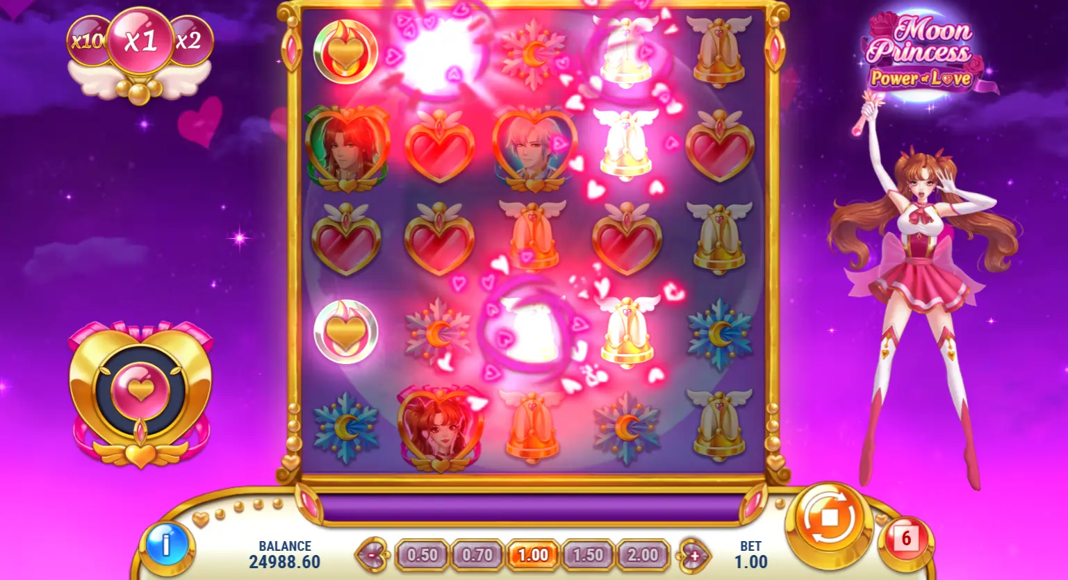 En Moon Princess Power of Love, tres poderosas princesas desatan su magia en una cuadrícula de 5×5. Mientras la princesa Love decide entre el príncipe Hail y el príncipe Blaze, puedes llenar el «Medidor del Amor» y activar poderes especiales que cambian símbolos o conectan los carretes.