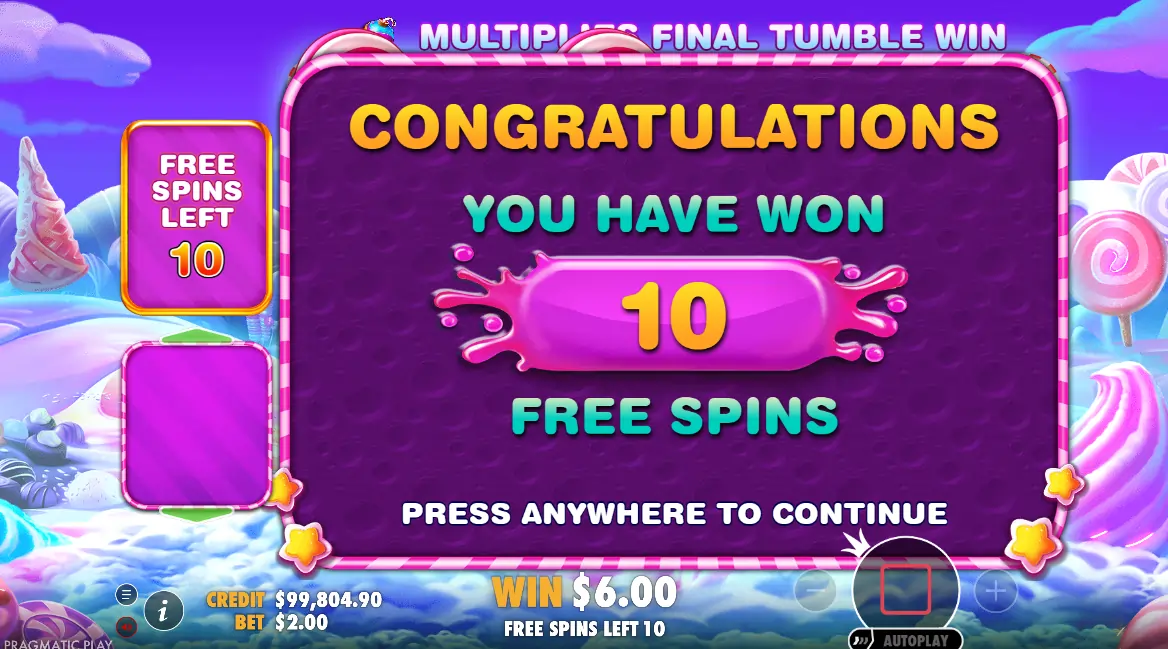 En nuestras pruebas, la ronda de giros gratis se activaba al aterrizar al menos cuatro scatters de piruletas en cualquier lugar de la cuadrícula. Comienza con 10 giros gratis, y los scatters adicionales pueden reactivar la función para obtener más.