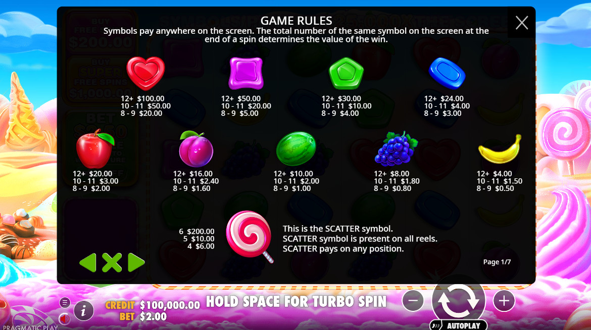 Los símbolos en Sweet Bonanza 1000 se ajustan perfectamente al tema de dulces del juego. Los carretes están llenos de frutas coloridas y golosinas, y la tabla de pagos es lo suficientemente simple como para entenderla después de solo unos pocos giros.