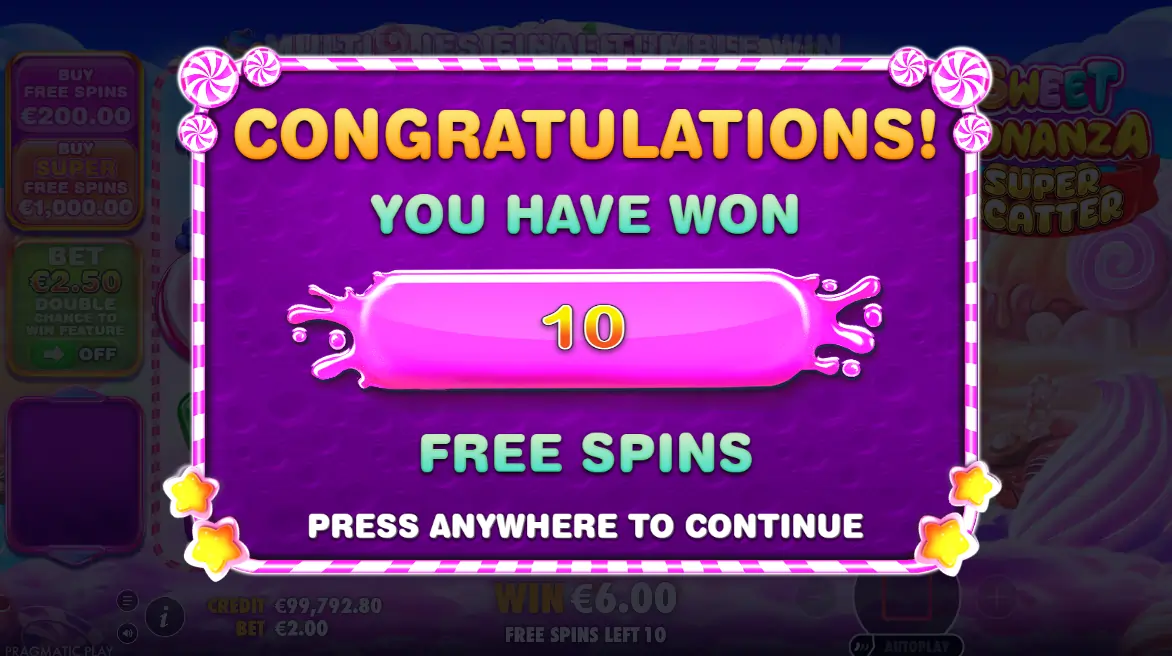 Los giros gratis se activan cuando caen cuatro o más scatters de piruleta en cualquier parte de los carretes. La ronda comienza con 10 giros, y si caen tres scatters adicionales durante la misma, se añaden cinco giros extra.